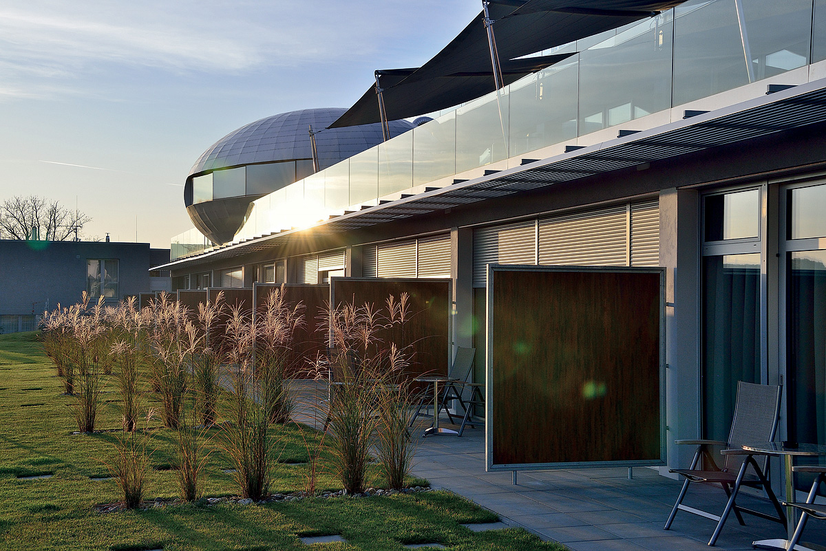 vnitřní bazén s protiproudem a vodoléčbou; venkovní bazén (biotop) s 20 m plaveckou dráhou, molem, lehátky a slunečníky; vnitřní vířivka až pro 10 osob, finská sauna, pára, infrasauna*, relaxační místnost s lehátky a výhledem; masáže*, perličková koupel*, suchá masážní vana*, turbosolárium*; nadstandardně vybavená posilovna, tělocvična, 2x kurt na squash či badminton; venkovní prostor vyhrazený pro cvičení, tenisový kurt, dráha na petanque
