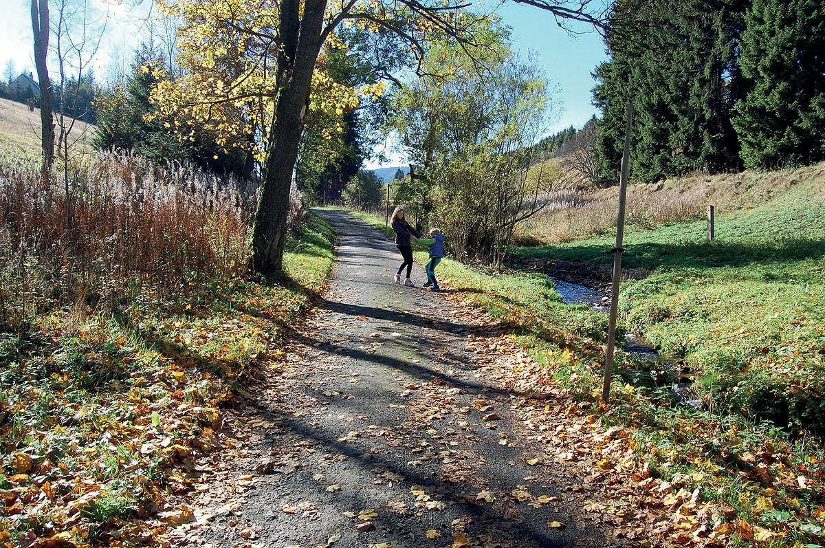 Naučná stezka liduprázdným okolím Potůčků vás provede rozmanitým terénem po zarostlých lesních stezkách, pohodlných zpevněných cestách i tvrdých asfaltkách. Věnuje se historii Potůčků, sousedního Johanngeorgenstadtu i dávno zaniklých obcí, hornictví i místní fauně a flóře. Místy vás sice čeká relativně prudší stoupání, na druhou stranu si pak odpočinete u oddechových úseků, jako je silnice podél říčky Černá. Z tzv. Sluneční stráně je pěkný výhled na Potůčky i Johanngeorgenstadt. Delší stoupání vás dovede k vrcholu Rudná (852 m n. m.), kde si můžete odskočit k hraničnímu kameni.