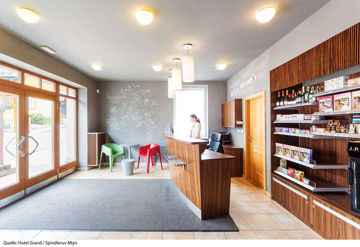 recepce, restaurace, bar, hotelový trezor, minimarket v objektu, wi-fi připojení k internetu, místnost pro úschovu zavazadel, úschovna lyží a kol, vyhrazené parkoviště, dobíjecí stanice pro elektromobily