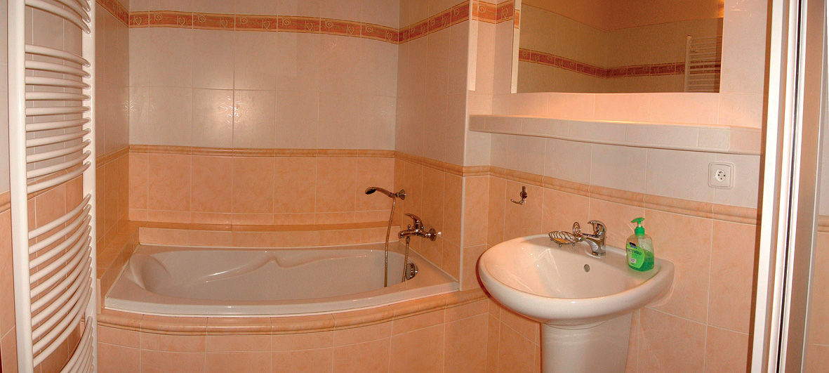 pokoj s manželskou postelí či 2 oddělenými lůžky, sociální zařízení se sprchou (u jednoho pokoje navíc i vana)