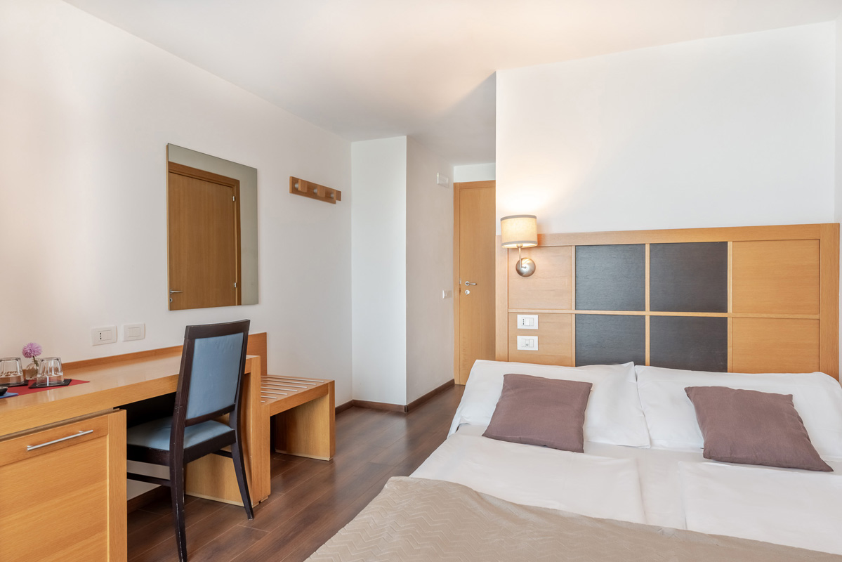 pokoj s manželskou postelí a případně gaučem či přistýlkou pro 1 osobu, sociální zařízení zpravidla se sprchou, zpravidla balkon