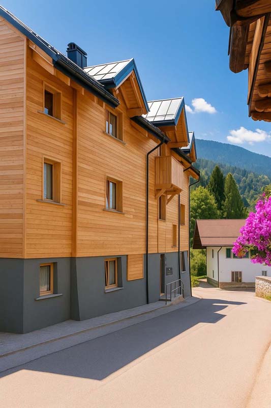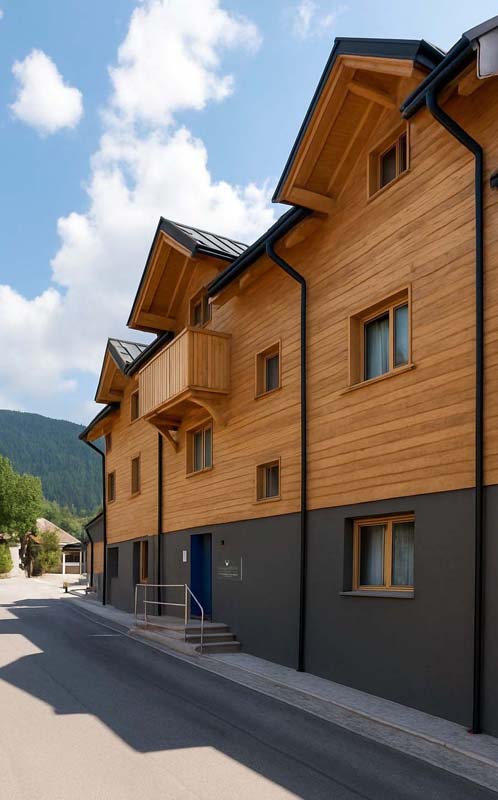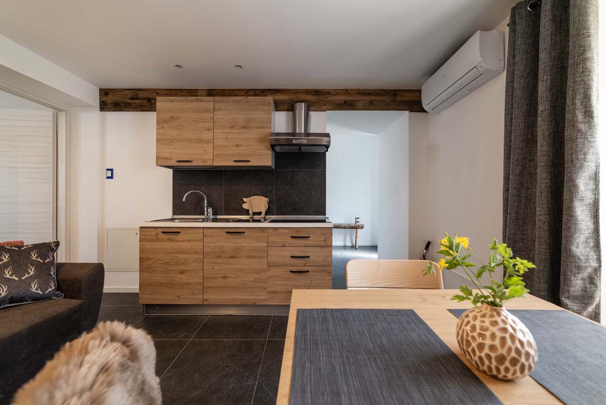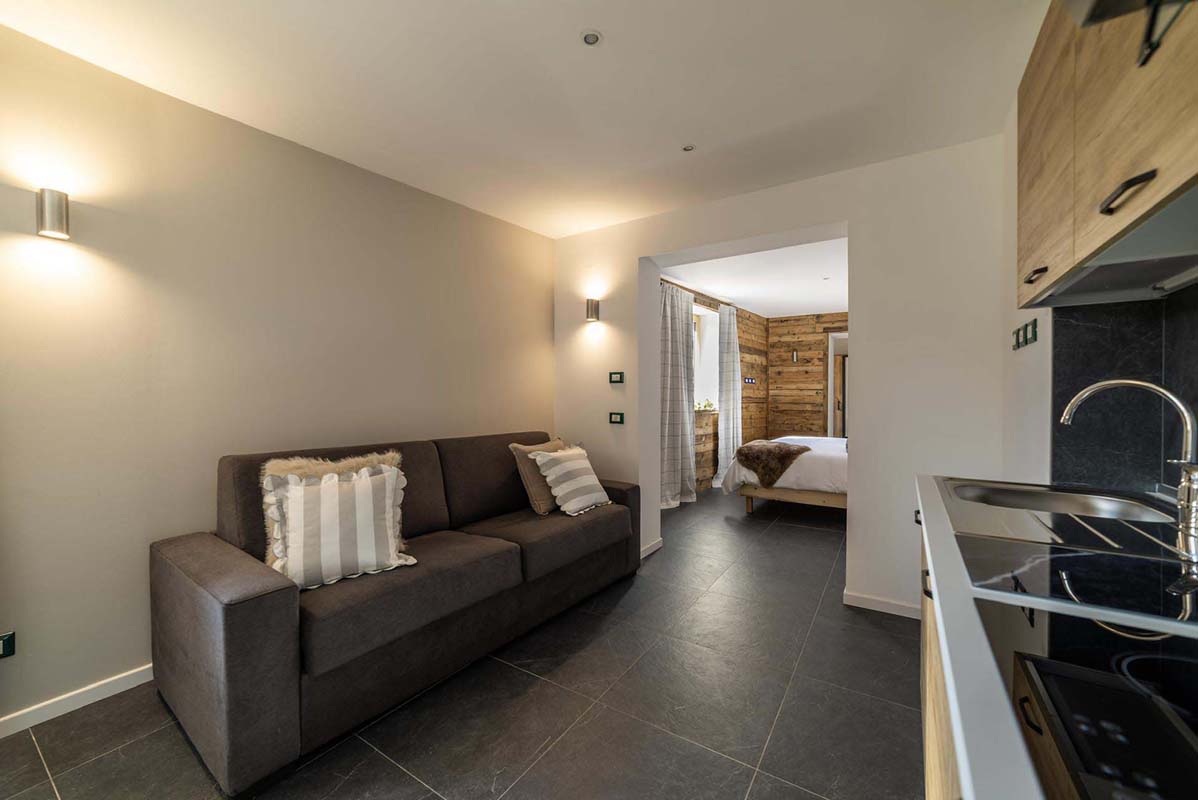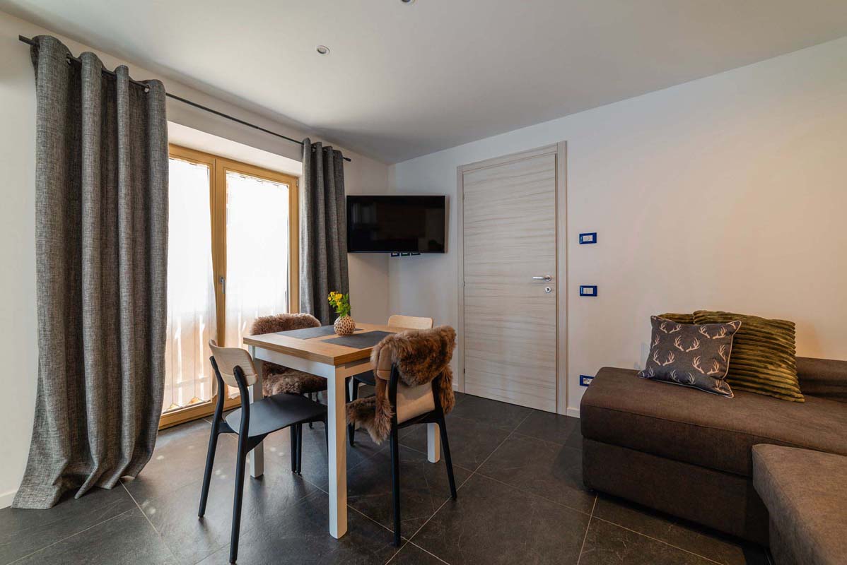 45 m² - 1 ložnice s manželskou postelí, obývací pokoj s kuchyňským koutem a rozkládacím gaučem pro 2 osoby (160x200), prostorné sociální zařízení se sprchovým koutem typu walk-in, balkon s panoramatickým výhledem; apartmán je situovaný ve druhém patře
