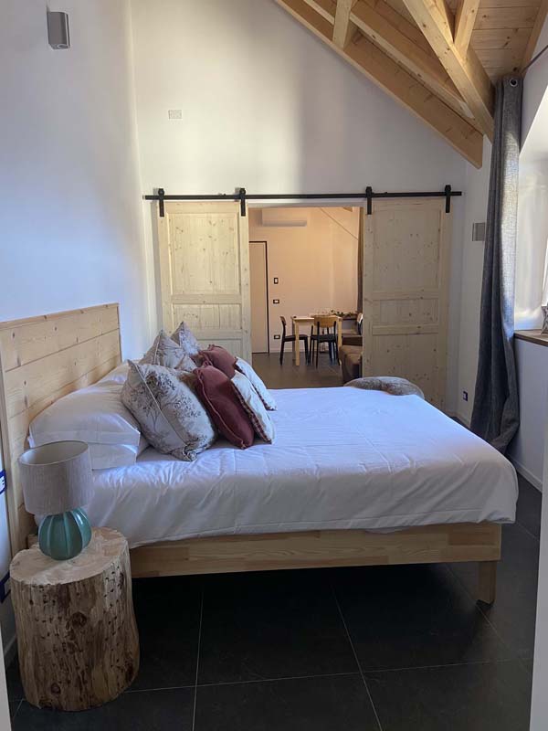 41 m² - 2x manželská postel v rámci neuzavřeného zvýšeného patra, obývací pokoj s kuchyňským koutem a rozkládacím gaučem pro 2 osoby (160x200), sociální zařízení se sprchovým koutem typu walk-in, balkon; apartmán je situován ve druhém patře