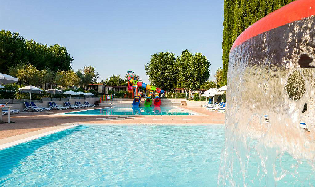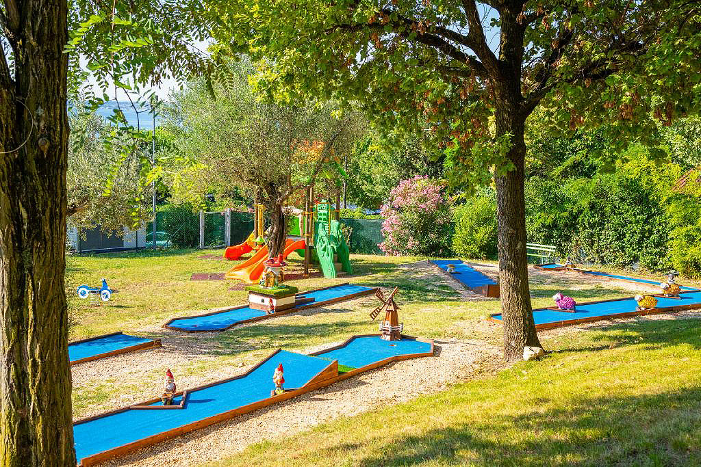 bazén 20 x 10 m s umělým vodopádem, lehátky a slunečníky, dětský bazén 9 x 6 m se skluzavkami, stolní tenis, minigolf, půjčovna lodí*