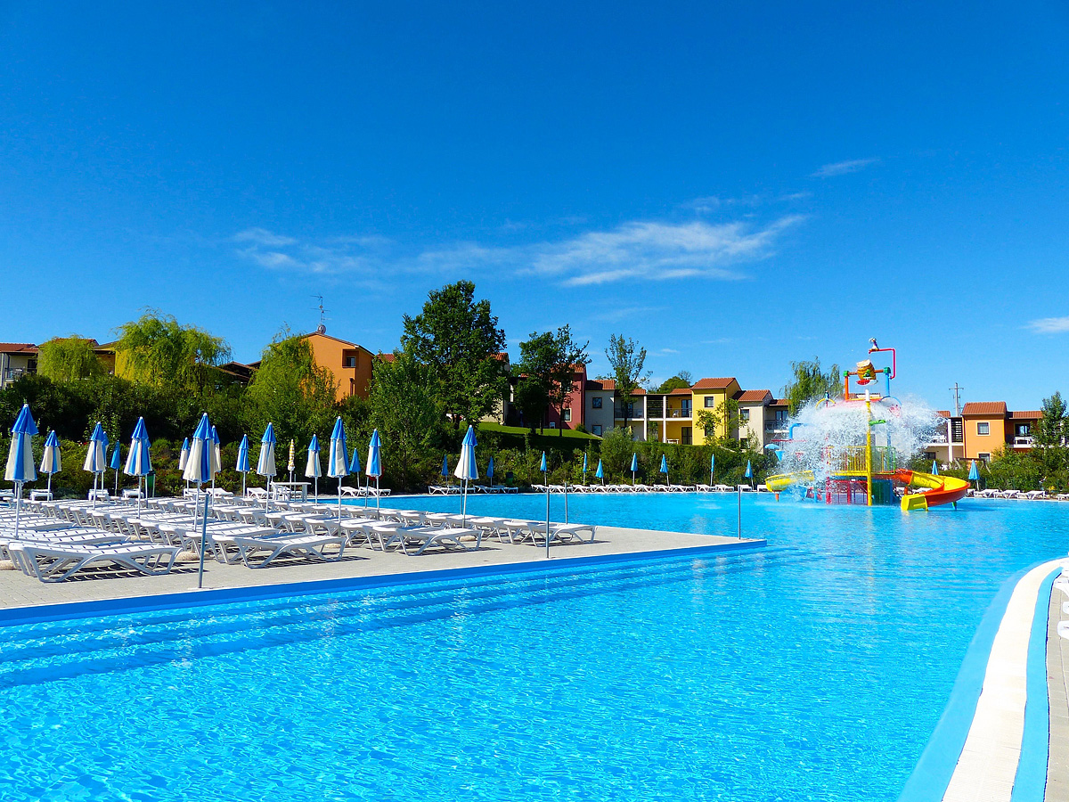 venkovní bazén se slunečníky a lehátky, dětský bazén, plážový volejbal, půjčovna kol*