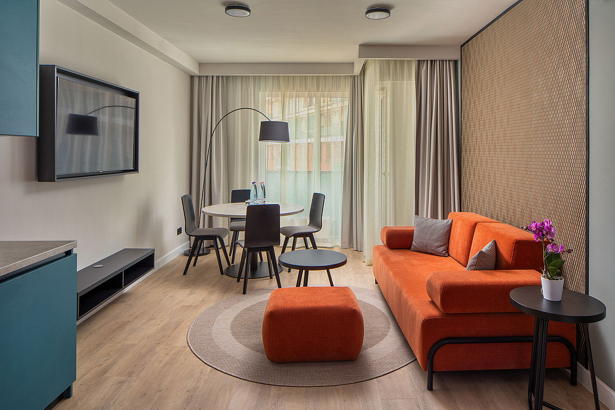 TV sat., telefon, fén, DVD přehrávač, trezor velikosti laptopu a dokovací stanici pro iPhone, wi-fi připojení k internetu, klimatizace, plně vybavená kuchyň s jídelním koutem (trouba a varná deska, mikrovlnná trouba, lednice s mrazákem, toustovač, varná konvice, nádobí, příbory), zpravidla balkon nebo terasa