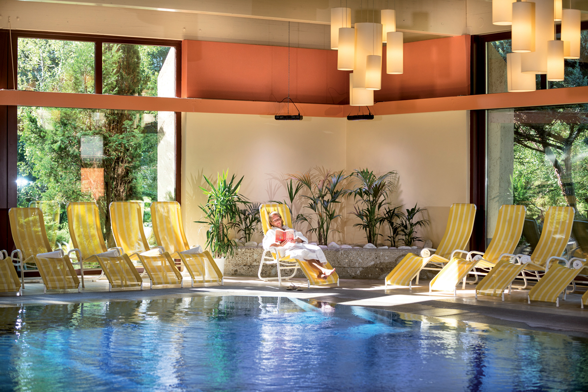 termální bazén 12 x 8 m, vířivka, finská sauna, bylinná sauna, pára, solná jeskyně, horizontální solárium*, relaxační koutek s lehátky, Kneippův chodník, masáže*, lázeňské kúry*, posilovna, sál pro aerobic s programem, vodní gymnastika, taneční večery s živou hudbou