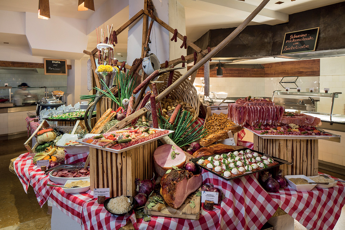 formou bohatého tématického bufetu studených a teplých předkrmů, hlavních jídel s přílohou, salátů, sýrů a dezertů, dětský bufet; od 10.00 do 22.00 hodin vybrané nealkoholické nápoje, točené pivo a stolní víno, míchané koktejly a vybrané lihoviny, ostatní nápoje za poplatek