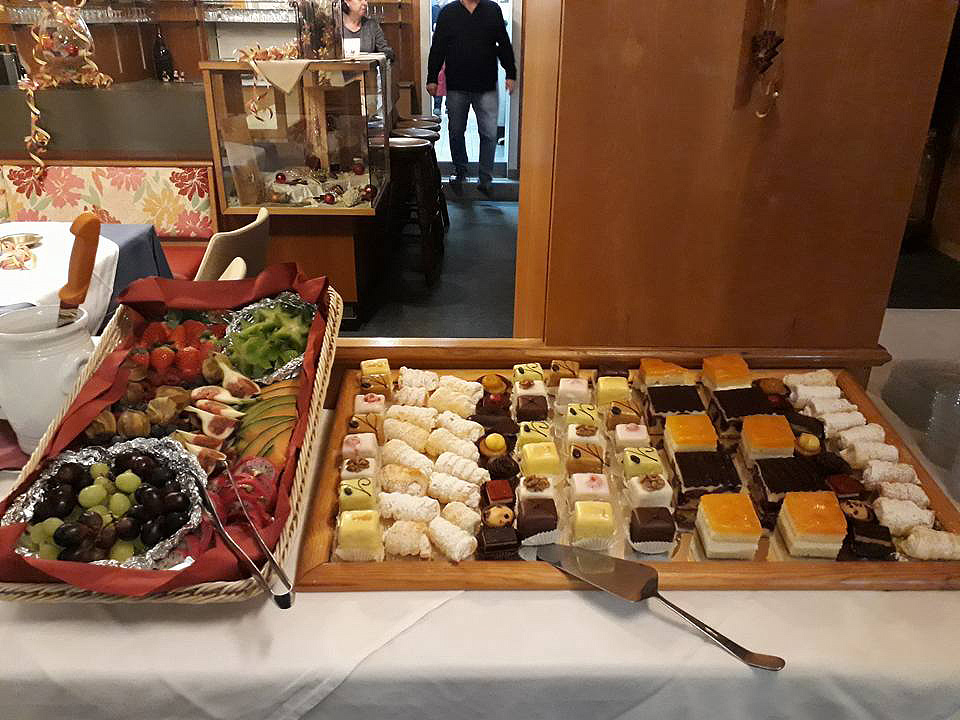 formou bufetu s výběrem hlavních jídel s přílohou či formou servírovaného 3chodového menu s výběrem ze 2 až 3 hlavních jídel s přílohou, salátový bufet, 1x vybraný nealkoholický nápoj či 0,5 l točeného piva nebo 0,25 l stolního vína, ostatní nápoje za poplatek