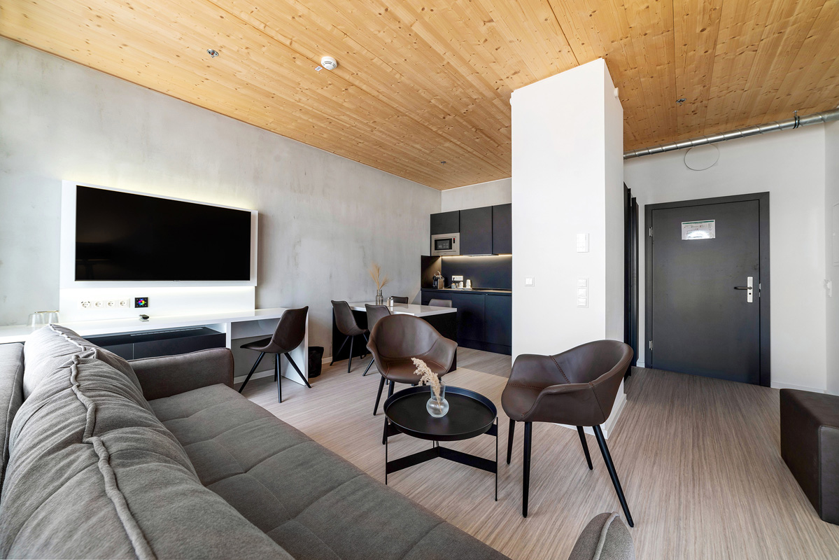 41 m² - ložnice s manželskou postelí, obývací pokoj s kuchyňským koutem a rozkládacím gaučem pro 1 osobu, sociální zařízení se sprchou; minimální obsazenost pokoje jsou 3 osoby či 2 osoby a 1 dítě