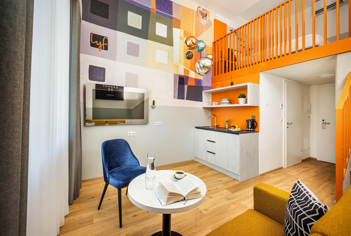 22 m² - ložnice s manželskou postelí, obývací pokoj s posezením a kuchyňským koutem, sociální zařízení se sprchou; zpravidla dvoupatrový pokoj s ložnicí v horní části přístupné po schodech