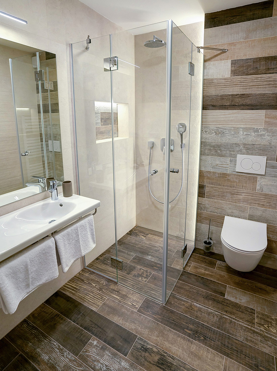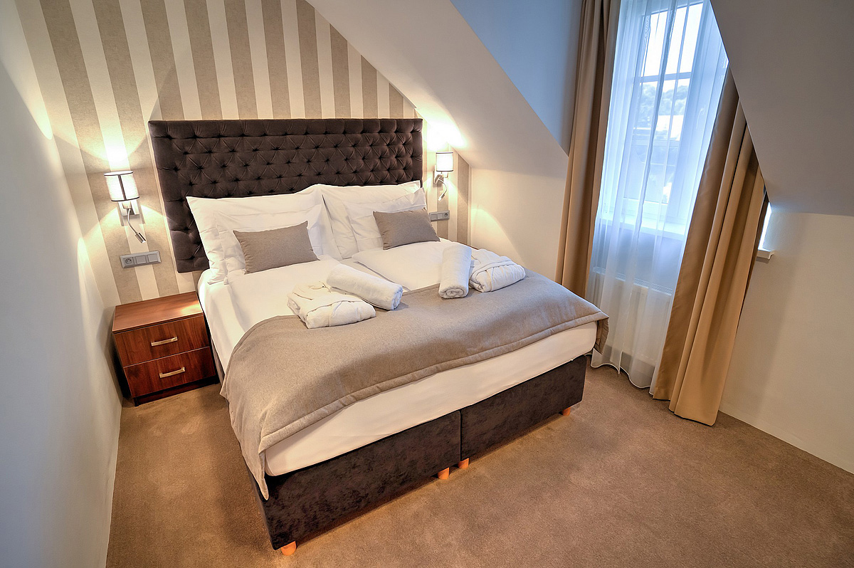 23 m² - pokoj s manželskou postelí (šířka 180 cm) nebo se 2 oddělitelnými lůžky a možností 1 přistýlky formou rozkládacího gauče, sociální zařízení se sprchou
