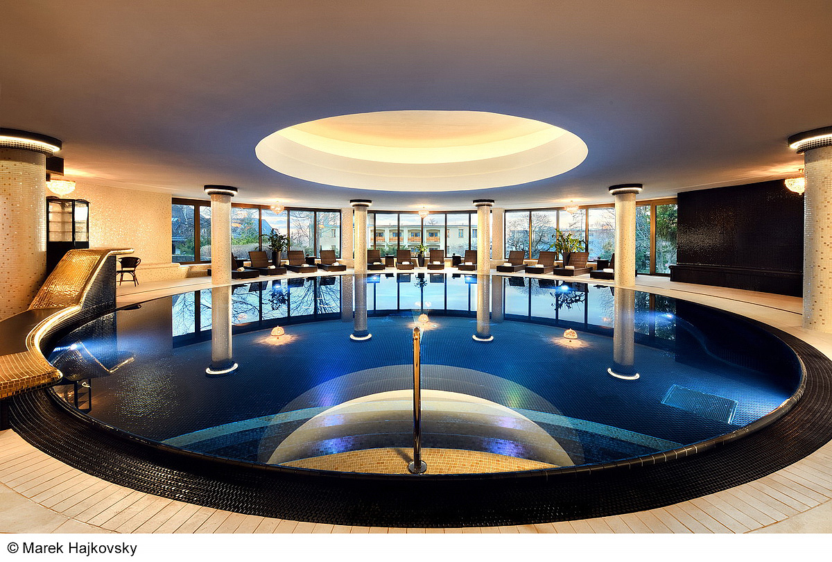 kruhový bazén o průměru 12 m s lehátky*, vířivka až pro 5 osob*, finská sauna, aromatická eukalyptová sauna, termárium, tepidárium, infrakabina, kneippův chodník, hydromasážní sprcha, masáže*, kosmetické služby*, nintendo Wii, biliár, knihovna, šachový stůl, společenské hry, šipky*, půjčovna kol*
