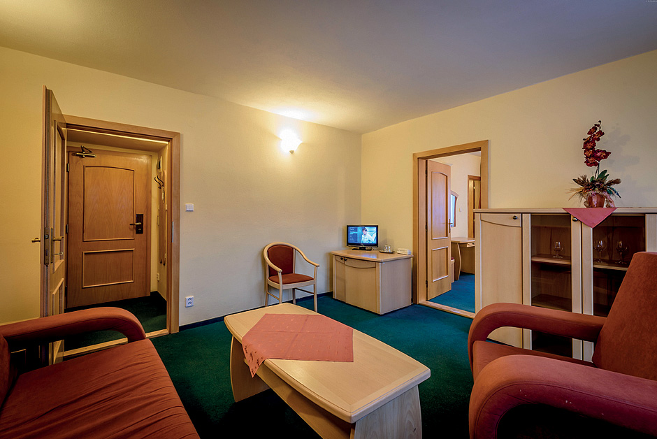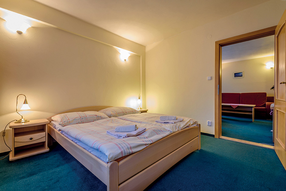 50 m² - 2 vzájemně propojené pokoje, v každém pokoji ložnice s manželskou postelí, sociální zařízení s vanou, balkon; možnost 1 přistýlky pro dítě do nedovršených 12 let do každého pokoje
