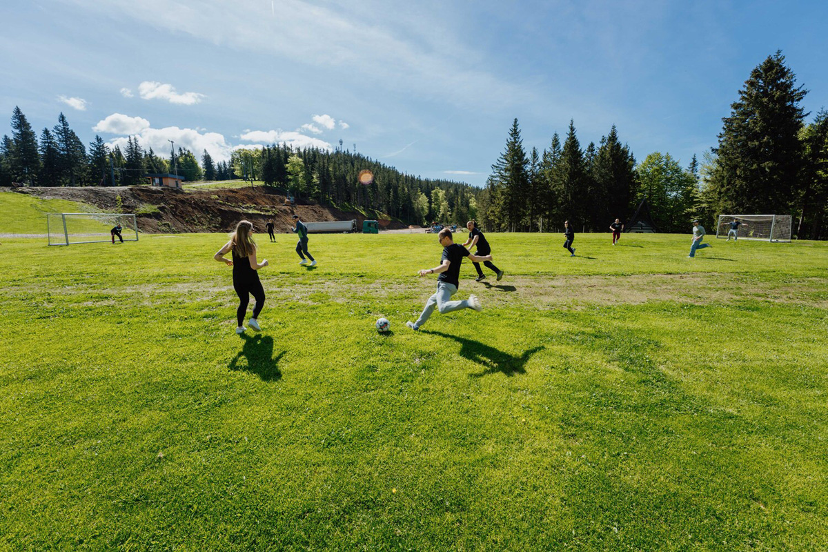venkovní sportoviště: fotbalové hřiště, písčité hřiště na volejbal, dětské hřiště