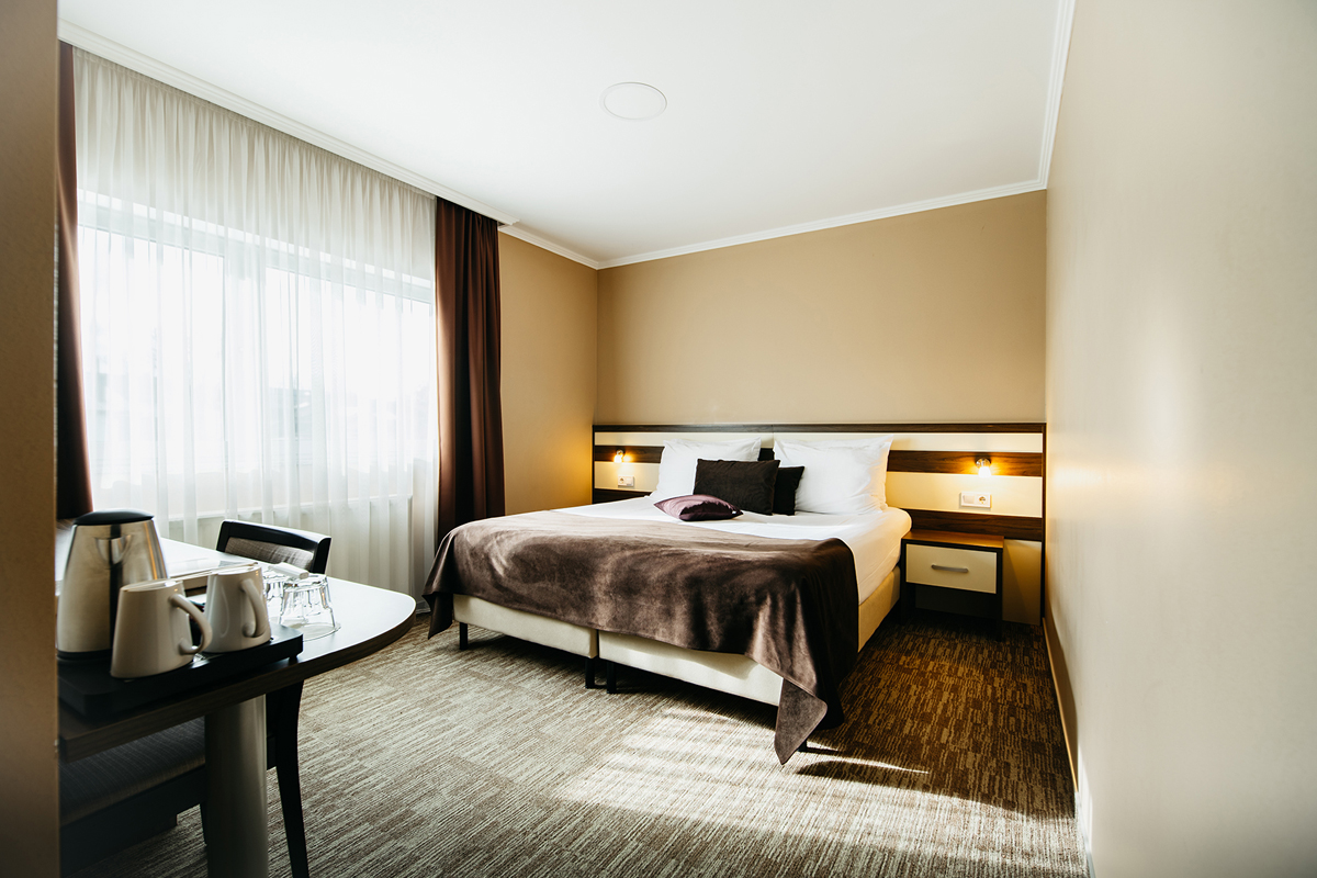 27 m² - pokoj s manželskou postelí či 2 samostatnými lůžky a rozkládací pohovkou pro 1 dospělého nebo 2 děti do nedovršených 14 let sociální zařízení se sprchou nebo vanou, balkon s výhledem do parku