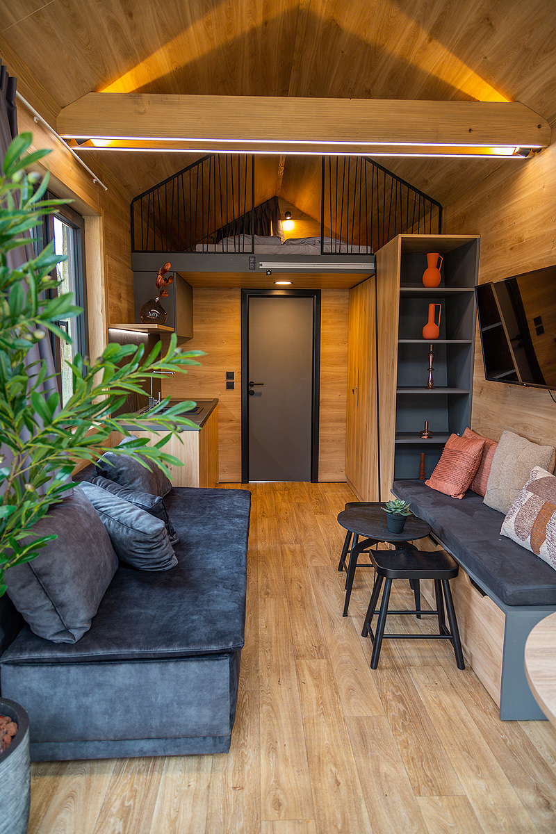 bilo 2 Tiny House - chalet, ložnice (umístění v patře) s manželskou postelí, obývací pokoj s kuchyňským koutem, sociální zařízení, terasa se zahradním nábytkem, max. obsazenost pro 2 osoby, upozornění: není možné umístit dětskou postýlku