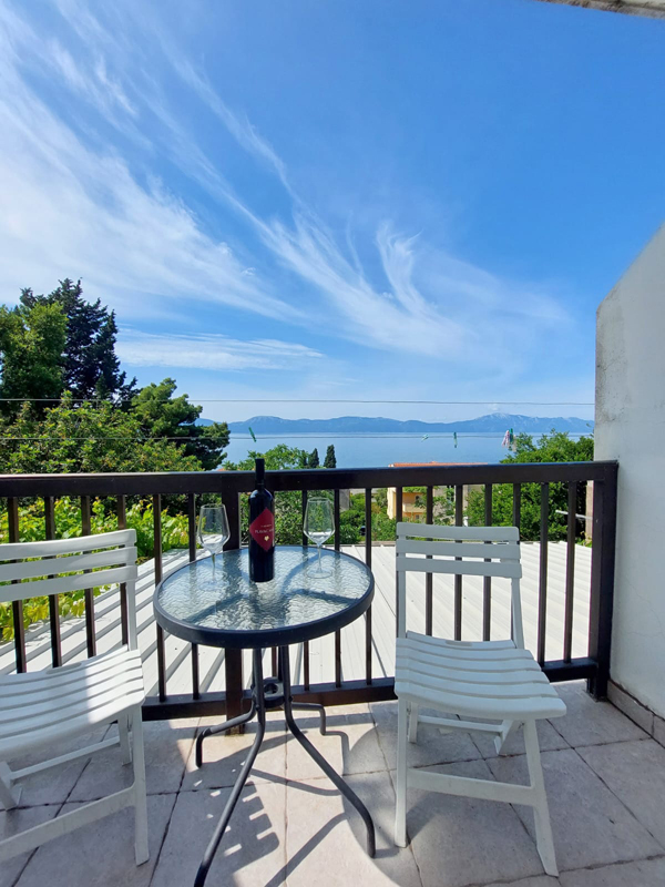 ložnice s manželskou postelí a kuchyňským koutem, od druhé místnosti se dvěma lůžky oddělené závěsem, sociální zařízení se sprchou, balkon orientovaný na mořskou stranu