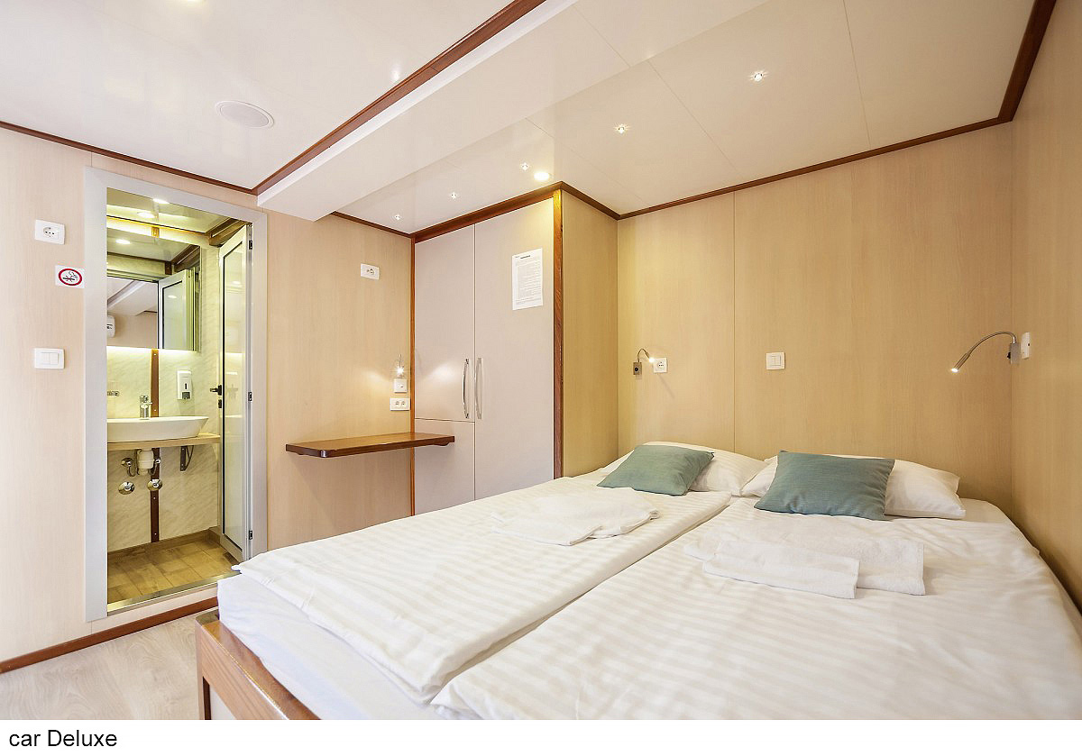 kajuta s dvěma oddělenými lůžky nebo manželskou postelí, vlastní sociální zařízení se sprchou a WC, popis platný i pro Deluxe 1