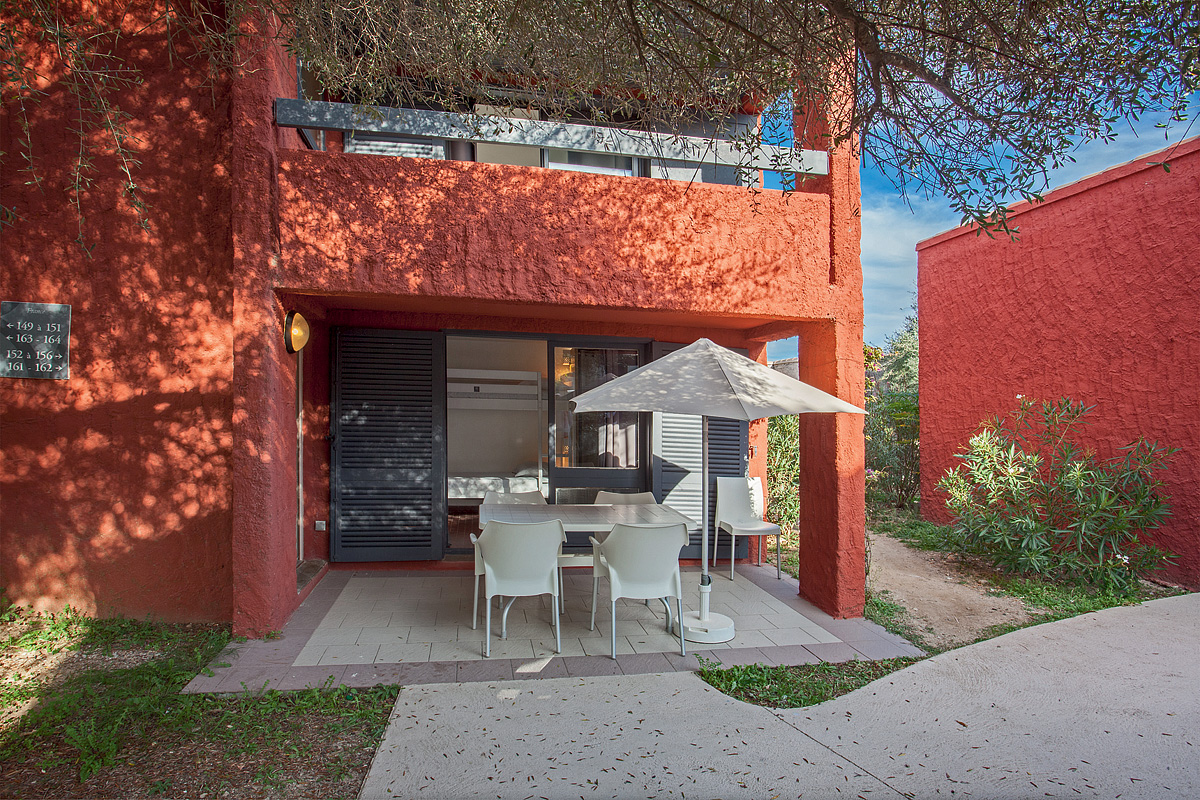 komplex několika přízemních či patrových domků v borovicovém háji, hlavní budova s restaurací, zázemí pro animační programy; resort se rozprostírá podél dlouhé písečné pláže