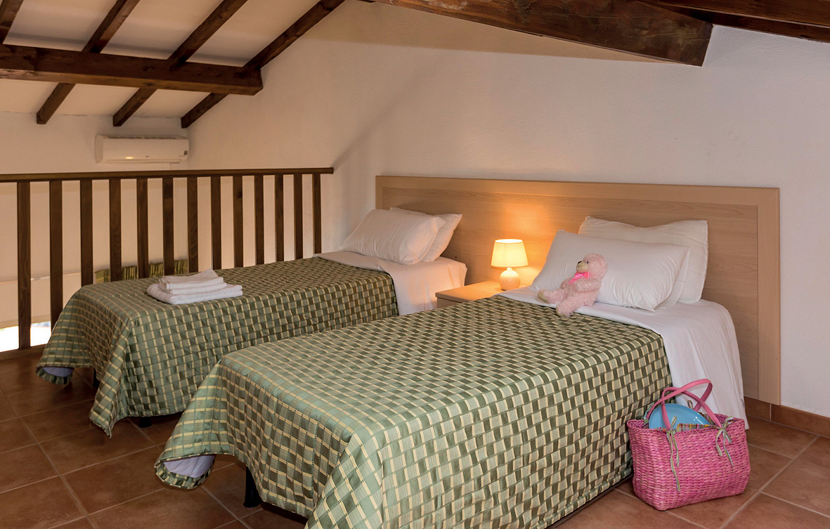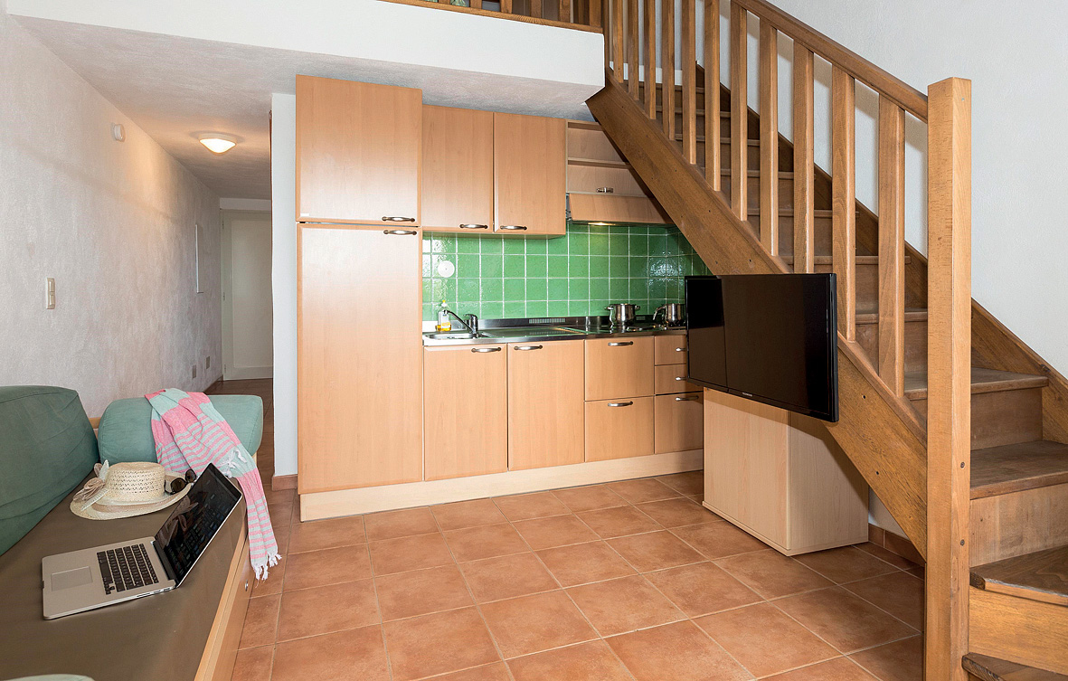54 m² - 1. podlaží apartmánu: 1 ložnice s manželskou postelí, obývací pokoj s kuchyňským koutem a rozkládacím gaučem pro 2 osoby (možno i typ "šuplík"), sociální zařízení se sprchou, balkon s posezením; 2. podlaží apartmánu (může být ve formě neuzavřeného patra): 1 ložnice se 2 samostatnými lůžky