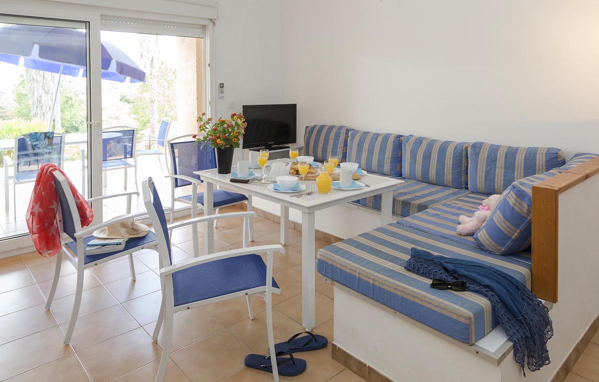 45 m² - 1 ložnice s manželskou postelí, obývací pokoj s kuchyňským koutem a rozkládacím gaučem typu „šuplík“ pro 2 osoby, sociální zařízení s vanou, prostorná terasa s výhledem na bazén