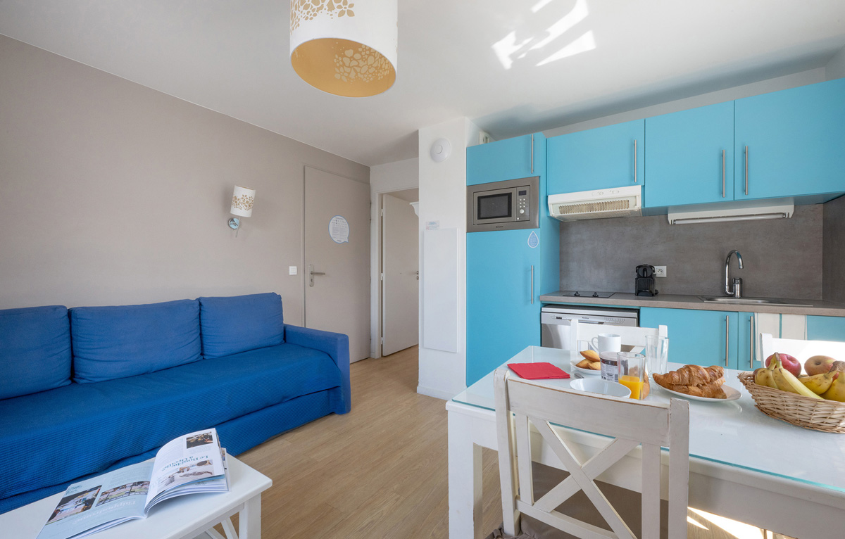 34 m² - 1 ložnice s manželskou postelí či s oddělitelnými lůžky, obývací pokoj s kuchyňským koutem a rozkládacím gaučem pro 2 osoby (možno i typ "šuplík"), sociální zařízení se sprchou, terasa či balkon