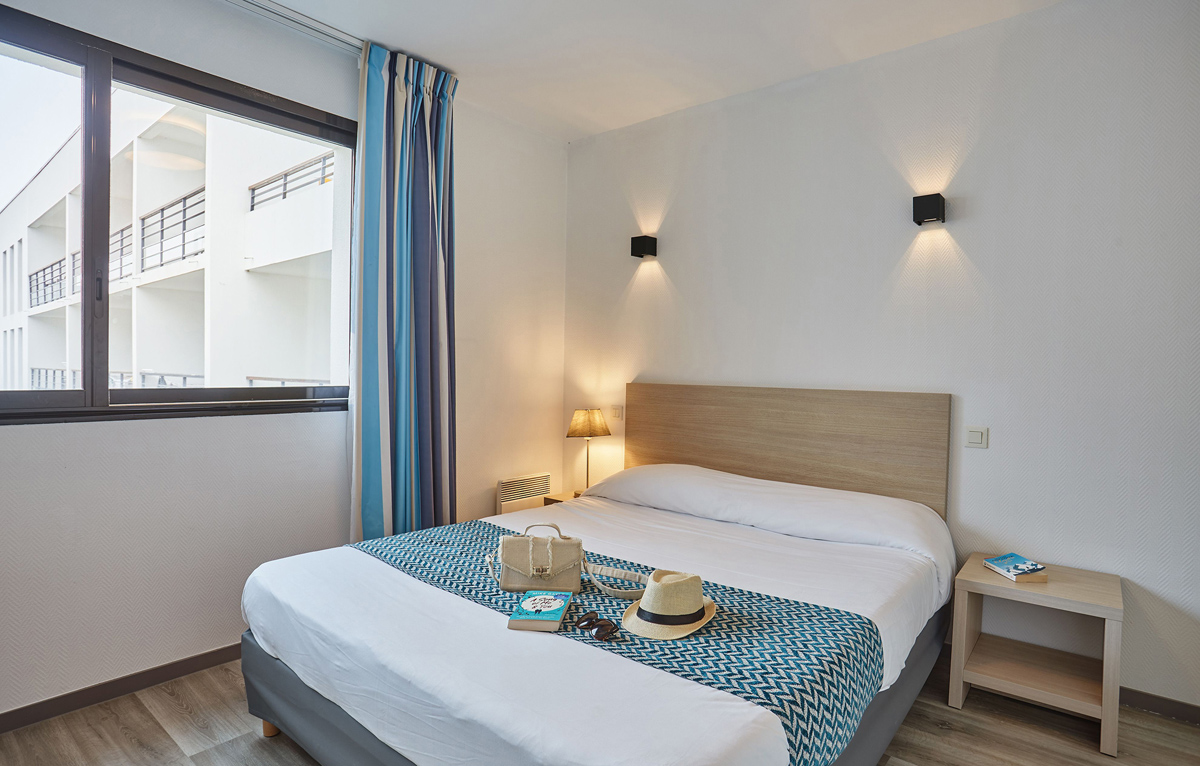 56 m² - 1 ložnice s manželskou postelí, kabina s palandou, obývací pokoj s kuchyňským koutem a rozkládacím gaučem pro 2 osoby (možno i typ "šuplík"), sociální zařízení se sprchou či vanou, balkon či terasa s posezením; některé apartmány mohou být dvoupodlažní