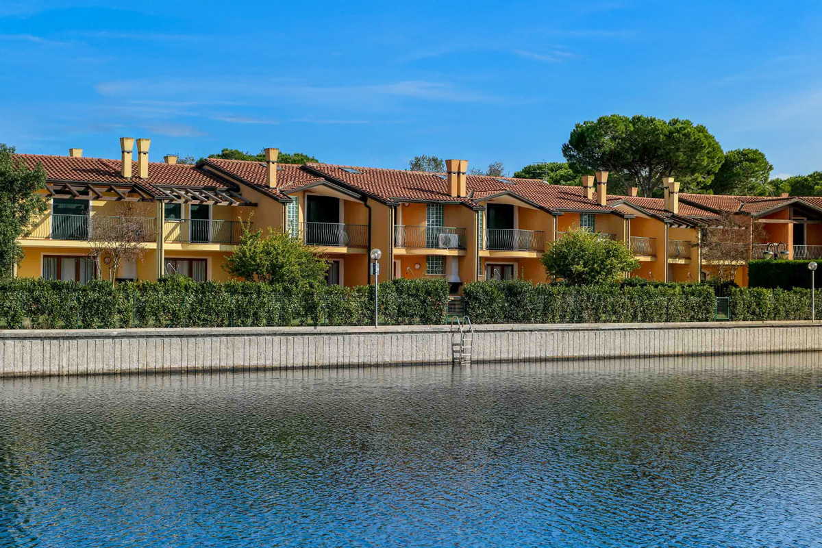 Jednopatrové řadové vilky v části Fiordo Diamante na ostrově Albarella, kde je možnost koupání v přírodní laguně (brankou ze zahrádky přímo přístup na společnou stezku podél laguny, vstup do vody po schůdkách).