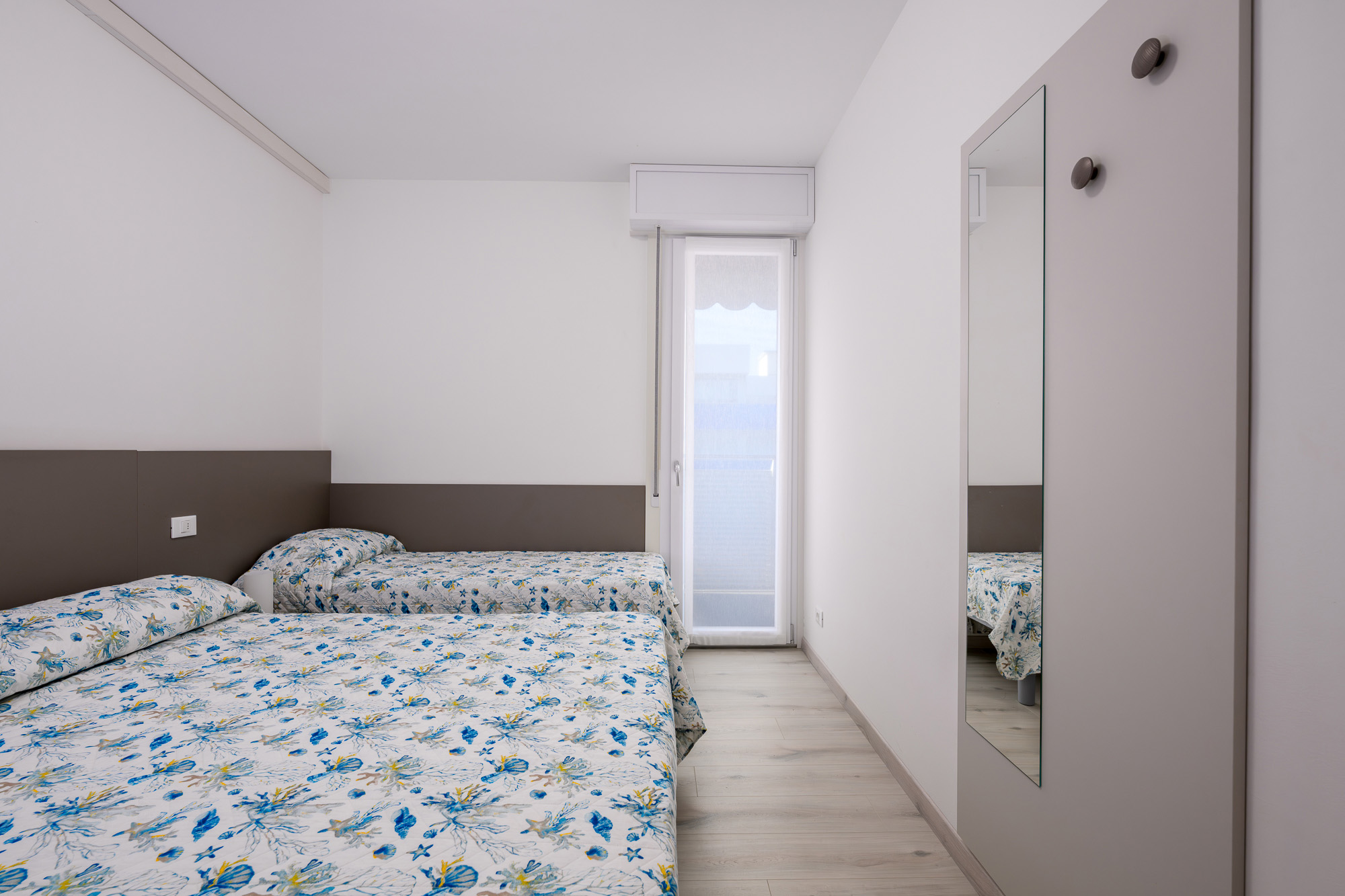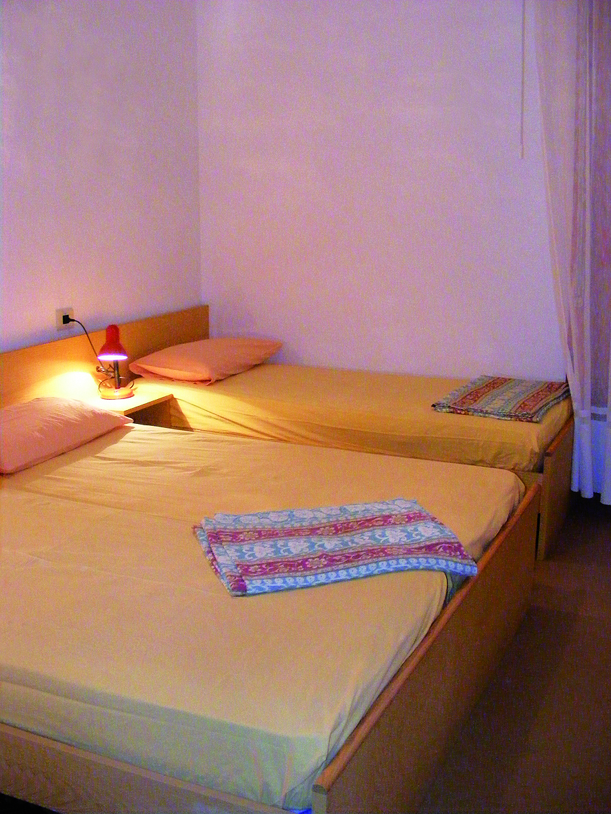 45 až 50 m² - 1 ložnice s manželskou postelí, 1 ložnice se 2 samostatnými lůžky či 1 samostatným lůžkem a palandou, obývací pokoj s kuchyňským koutem a rozkládacím gaučem (možnost typ "šuplík") pro 2 osoby, sociální zařízení se sprchou, balkon a terasa; trilo 6+ zrekonstruované