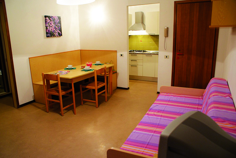 35 m² - 1 ložnice s manželskou postelí a případně 1 samostatným lůžkem, obývací pokoj s kuchyňským koutem a rozkládacím gaučem pro 2 osoby, sociální zařízení se sprchou, balkon; bilo 5+ zrekonstruované