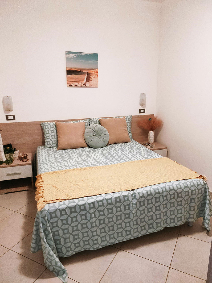 1 ložnice s manželskou postelí, 1 ložnice s palandou a jedním samostatným lůžkem, obývací pokoj s kuchyňským koutem a rozkládacím gaučem pro 1 osobu, sociální zařízení se sprchou, menší terasa se společnou zahradou
