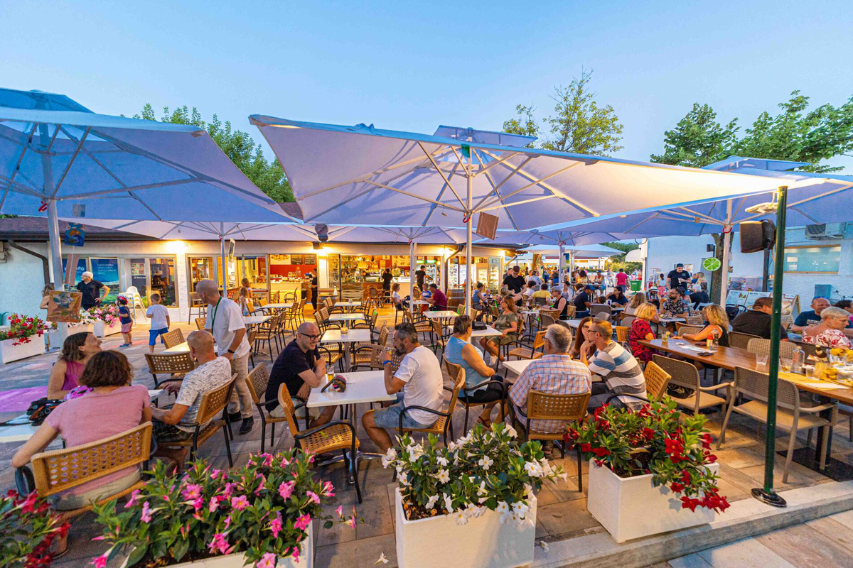 recepce, bar a restaurace, 2 pizzerie, snack bar, jogurteria a zmrzlinárna, dětský koutek, dětský klub a animační programy (cca od konce května do začátku září), vyhrazené parkoviště, prádelna*, myčka aut*, minimarket, obchod s ovocem, zeleninou, suvenýry, tabákem, divadlo, herny, diskotéka, lékařská pohotovost (v hlavní sezóně), kadeřnictví*, bankomat, wi-fi připojení k internetu*, místní motorový vláček