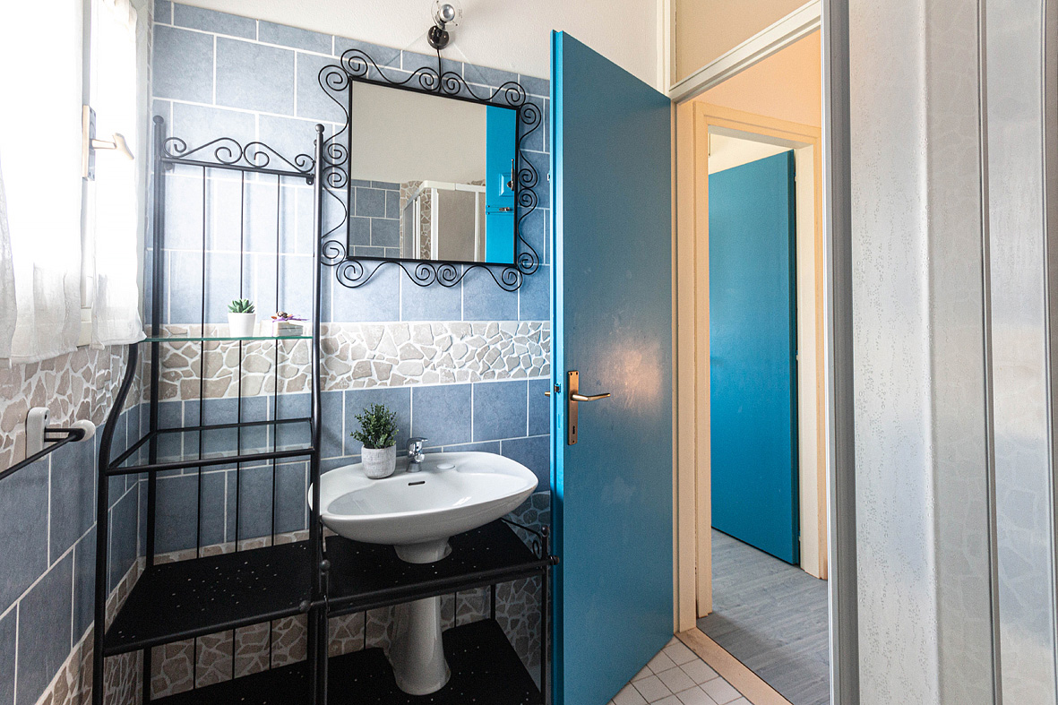 47 m² - přízemí: obývací pokoj s kuchyňským koutem a rozkládacím gaučem pro 2 osoby, terasa či předzahrádka; 1. patro: 1 ložnice s manželskou postelí, 1 ložnice se 2 samostatnými lůžky či palandou, 2 sociální zařízení se sprchou, pračka, menší balkon; nelze se psem