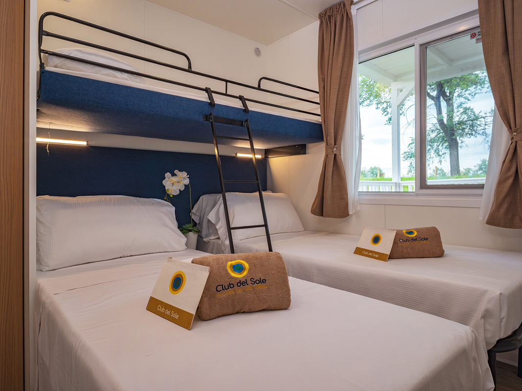 33 m² - ložnice s manželskou postelí, ložnice se 2 samostatnými lůžky a zavěšeným lůžkem (pro dítě do nedovršených 10 let), obytná část s kuchyňským koutem, 2 sociální zařízení se sprchou, krytá uzavíratelná terasa se zahradním nábytkem