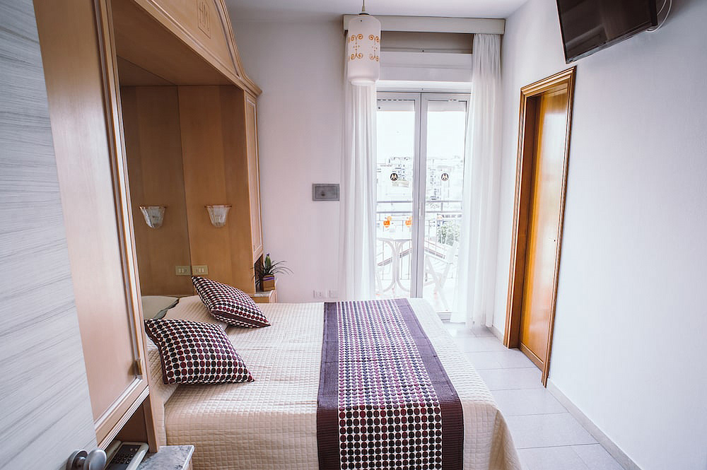 pokoj s manželskou postelí či 2 samostatnými lůžky, sociální zařízení se sprchou, balkon