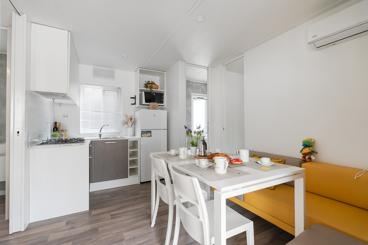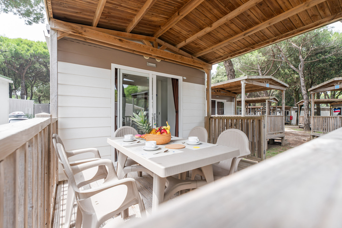 31 m² - ložnice s manželskou postelí, ložnice se 2 samostatnými lůžky a zavěšeným lůžkem (pro dítě do nedovršených 10 let), obytná část s kuchyňským koutem, 2 sociální zařízení se sprchou, krytá uzavřená terasa