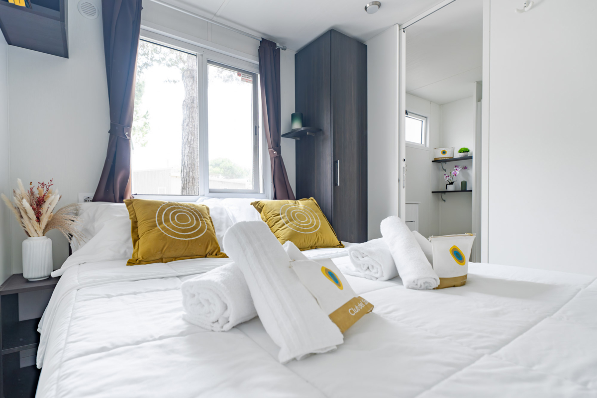 25 m² - ložnice s manželskou postelí, ložnice se 2 samostatnými lůžky a zavěšeným lůžkem (pro dítě do nedovršených 10 let), obytná část s kuchyňským koutem, sociální zařízení se sprchou, krytá uzavřená terasa