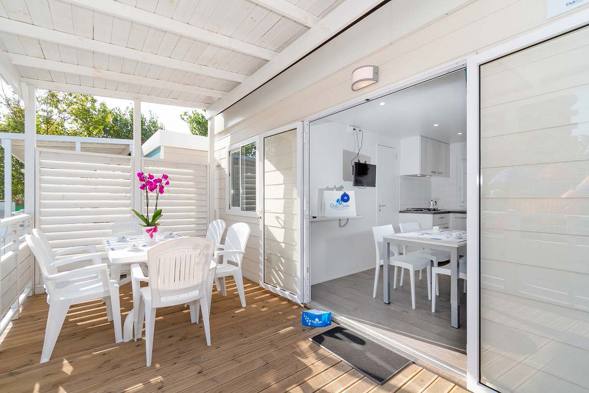 33 m² - ložnice s manželskou postelí, ložnice se 2 samostatnými lůžky a zavěšeným lůžkem (pro dítě do nedovršených 10 let), obytná část s kuchyňským koutem, 2 sociální zařízení se sprchou, krytá dřevěná terasa