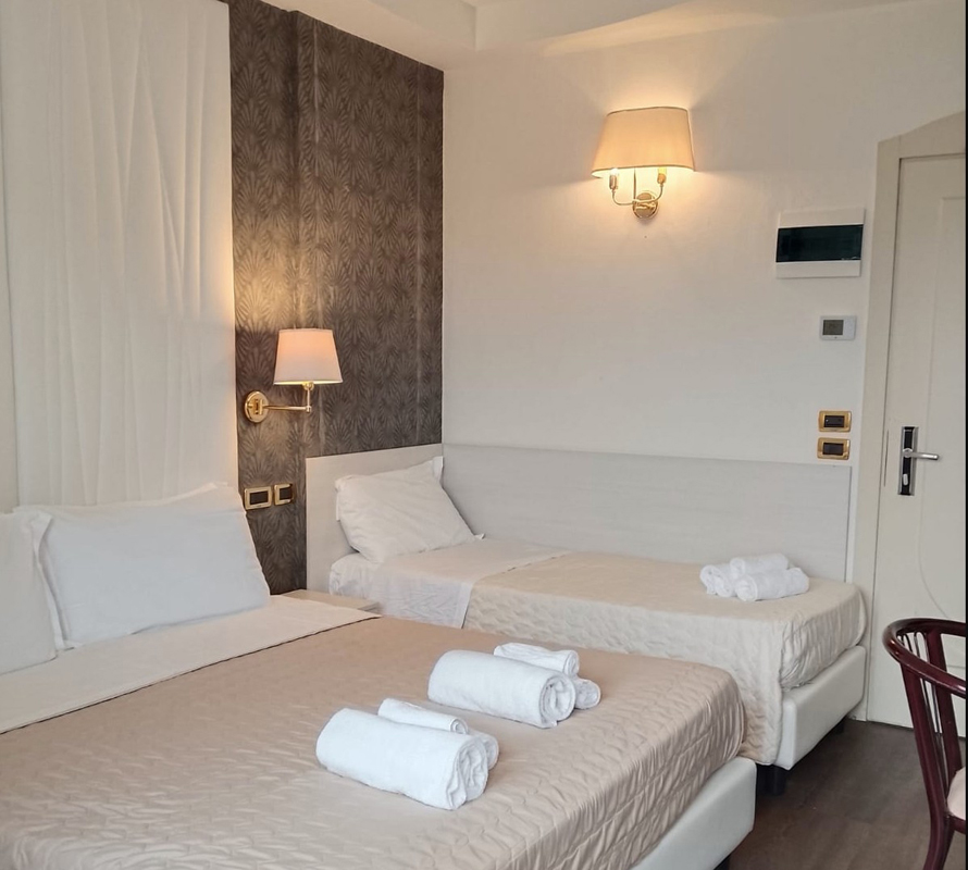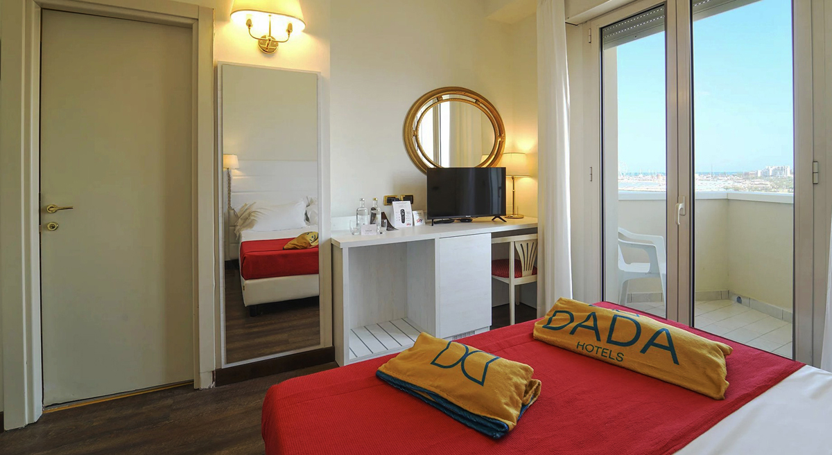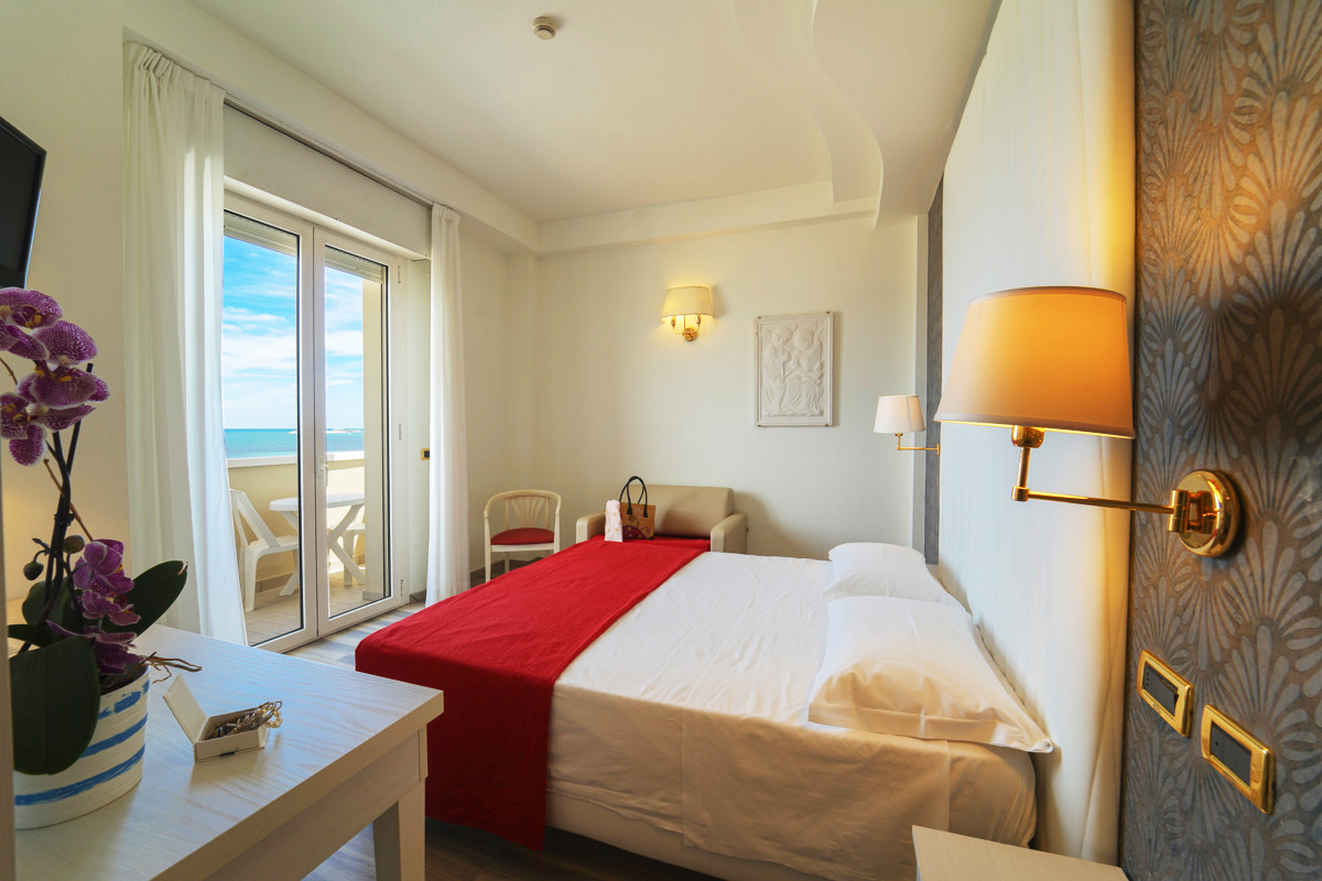 pokoj s manželskou postelí či 2 samostatnými lůžky, sociální zařízení se sprchou, zpravidla balkon s bočním výhledem na moře; 3. lůžko formou přistýlky, 4. lůžko vždy palanda