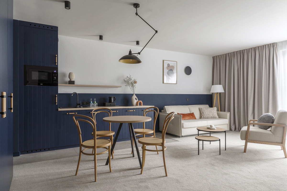 30–45 m² – ložnice s manželskou postelí typu Queen size bed, obývací pokoj s rozkládacím gaučem formou přistýlky až pro 2 osoby, kuchyňský kout, sociální zařízení, balkon či terasa