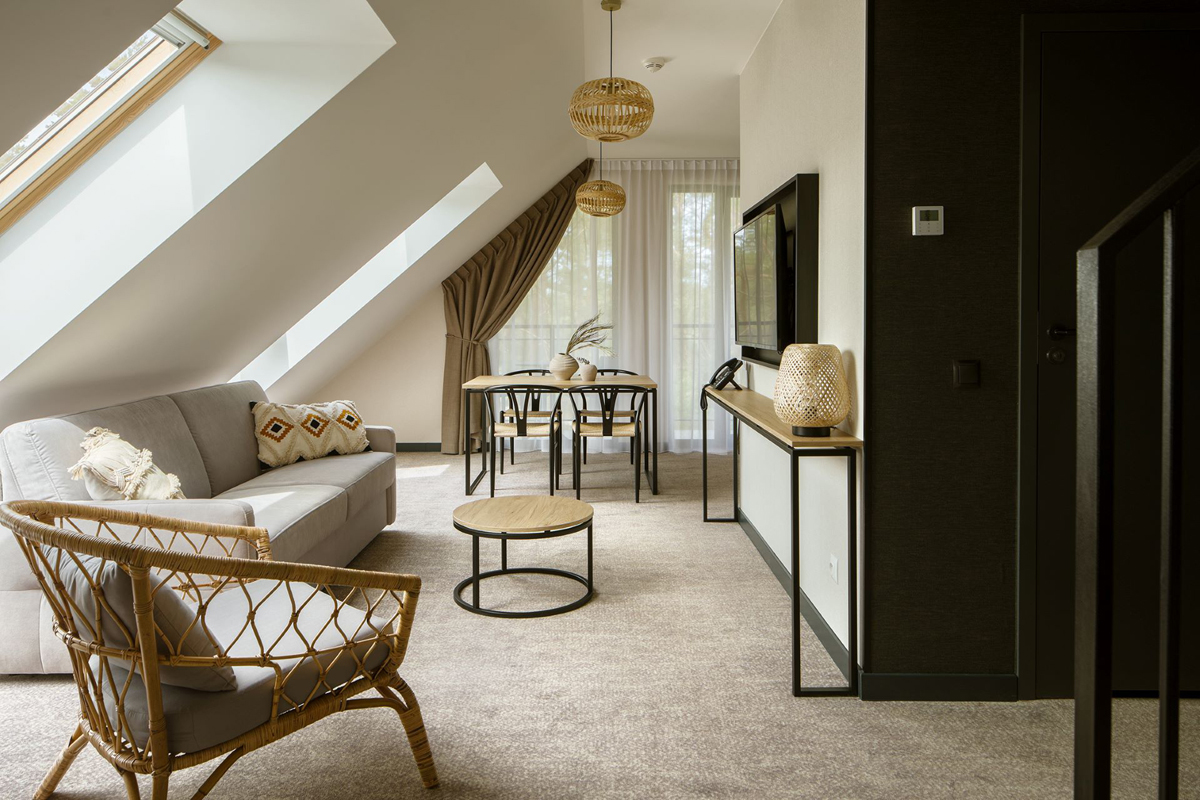 moderní resort se skládá ze tří budov – Morze, Las a nová budova Ziemia; v klidné části Łeby mezi Baltským mořem a Sarbrským jezerem