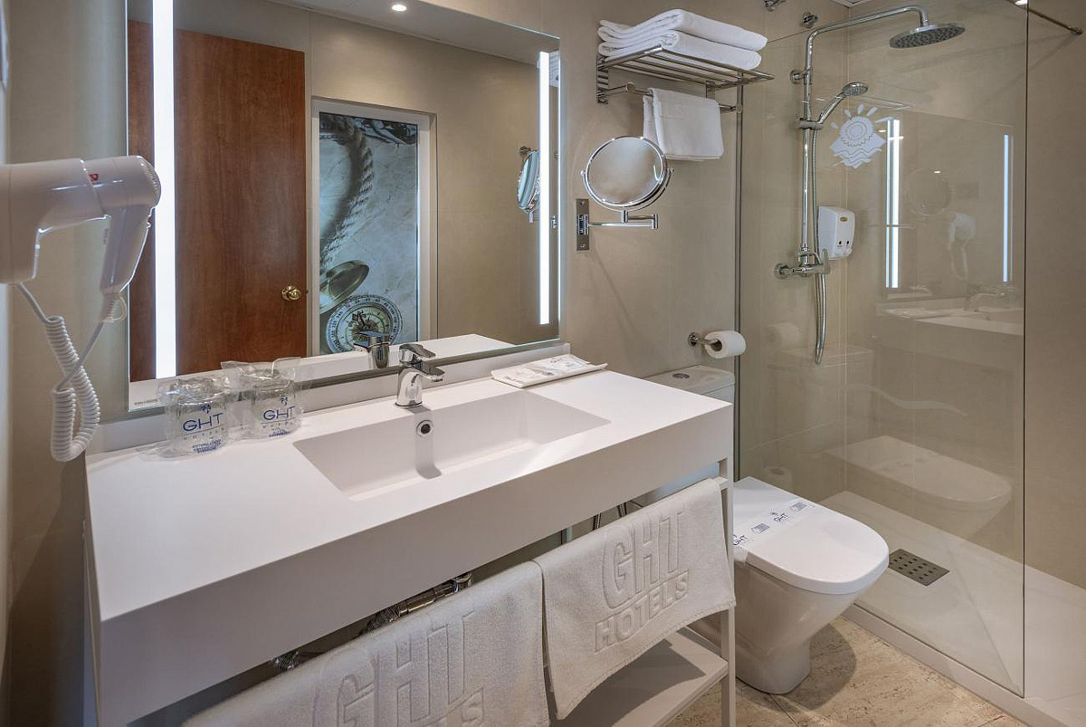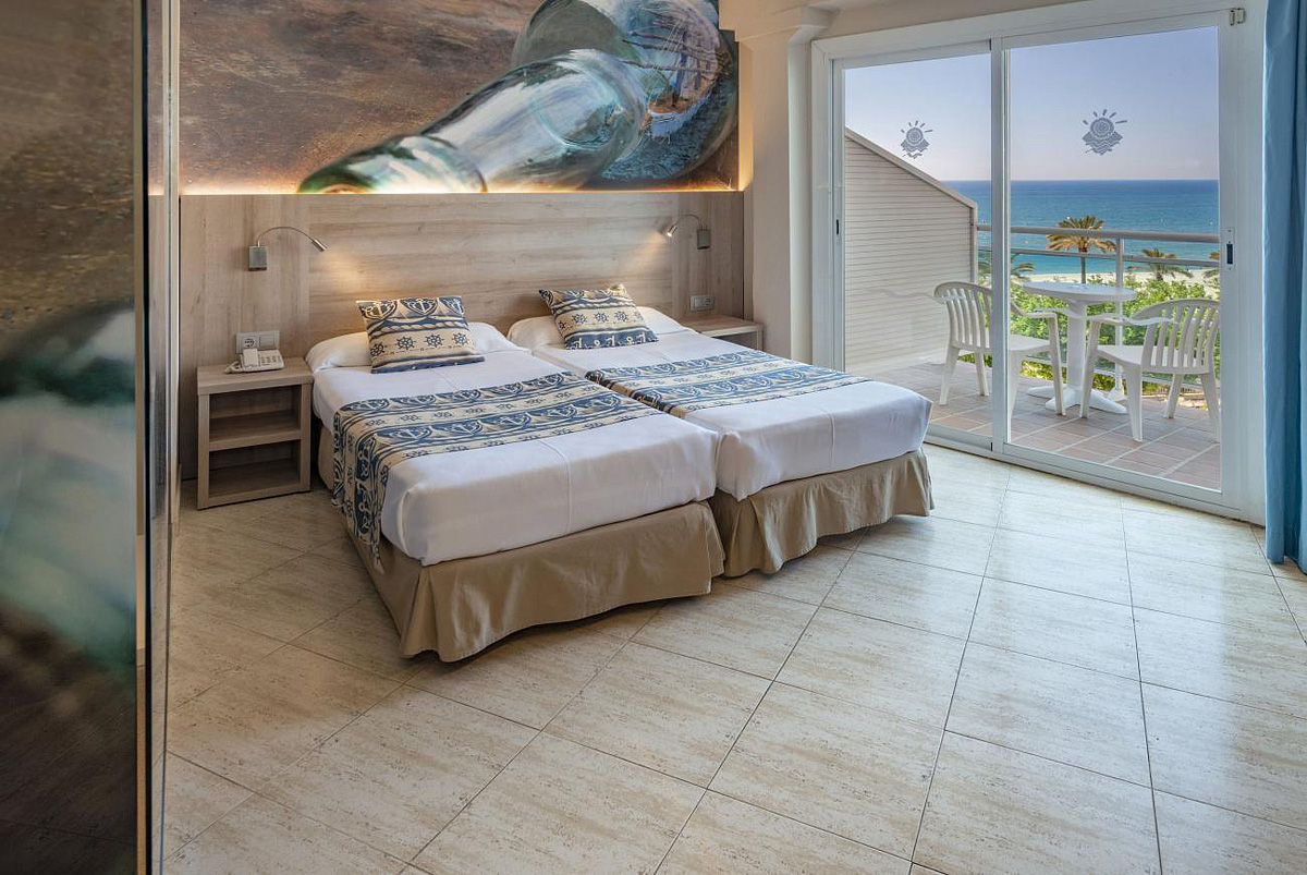 pokoj s manželskou postelí či 2 samostatnými lůžky, sociální zařízení, balkon s výhledem na moře; 3. lůžko zpravidla formou přistýlky či rozkládacího křesla