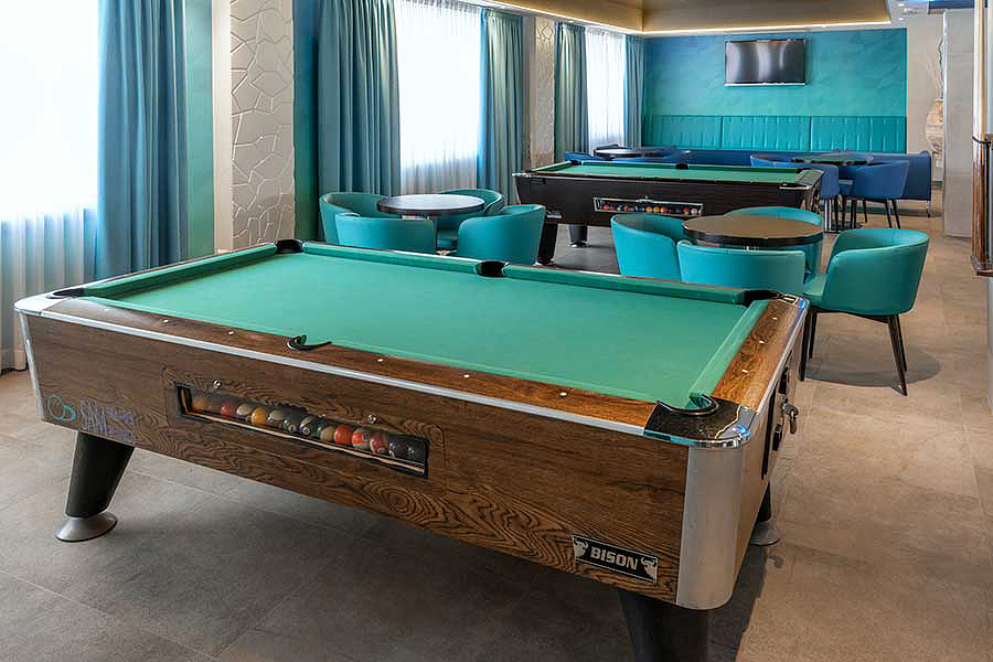 bazén s lehátky a slunečníky, bar u bazénu, dětský bazének, posilovna, stolní tenis*, biliard*, solárium*, sauna*