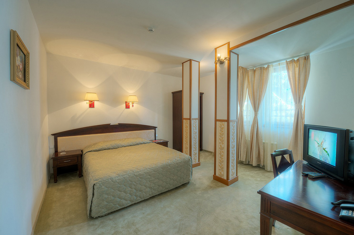 pokoj s manželskou postelí s oddělitelnými lůžky a případně rozkládacím křeslem na lůžko pro 1 osobu, sociální zařízení; pokoj obsazený 1 osobou