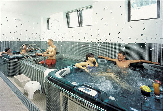2x vířivka* až pro 8 osob, finská sauna*, ledová lázeň*, malá posilovna, biliár*, stolní tenis, stolní fotbal*