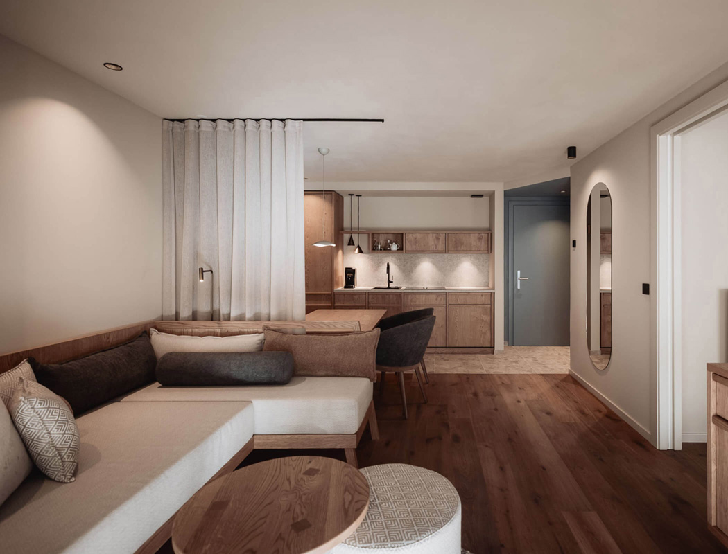 bilo 3+1 Suite Larix - 75 m² - 1 ložnice s manželskou postelí, obývací pokoj s kuchyňským koutem, rozkládacím gaučem (boxspring) pro 1 osobu a případně přistýlkou, sociální zařízení se sprchou, balkon; maximální obsazenost apartmánu jsou 3 dospělé osoby a 1 dítě do nedovršených 18 let; uvedená plocha je včetně balkonu