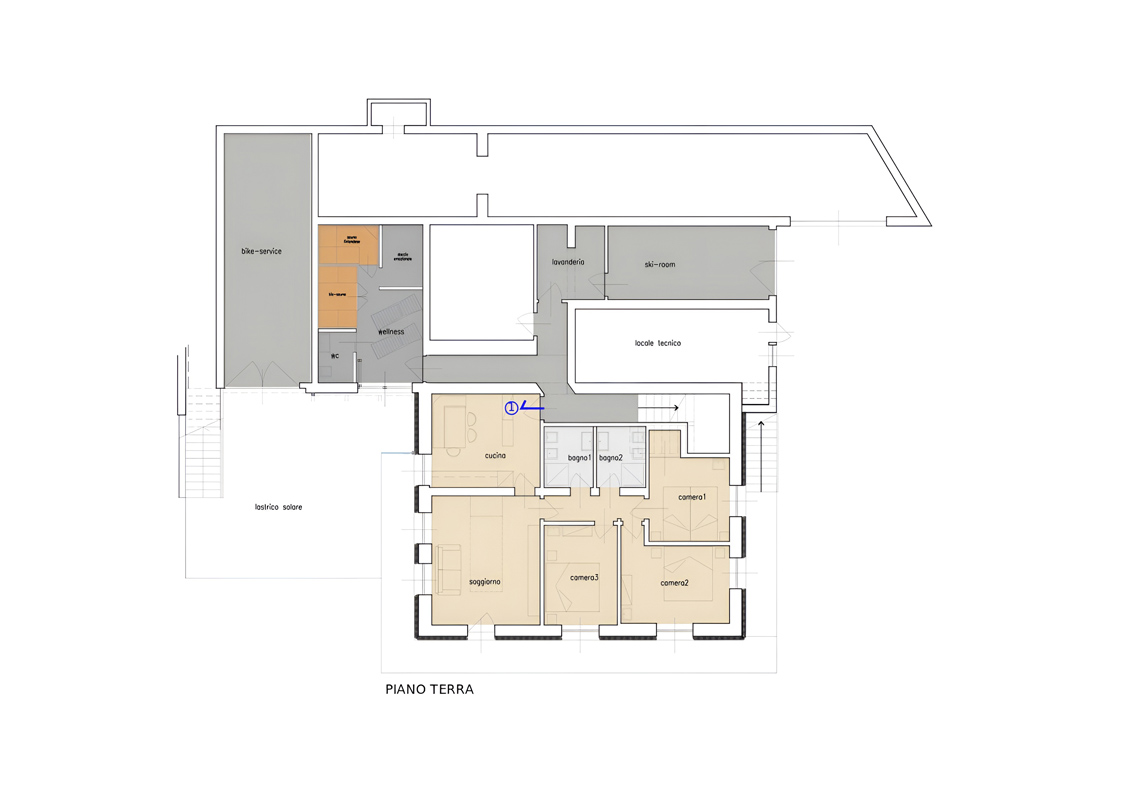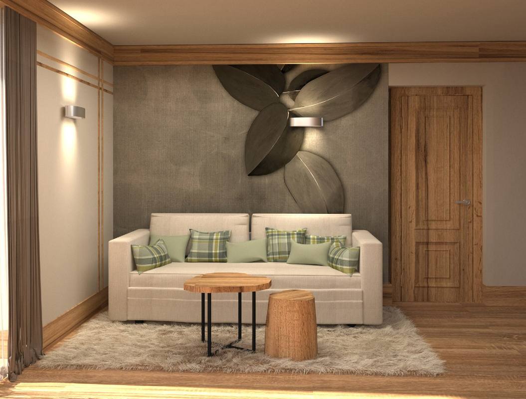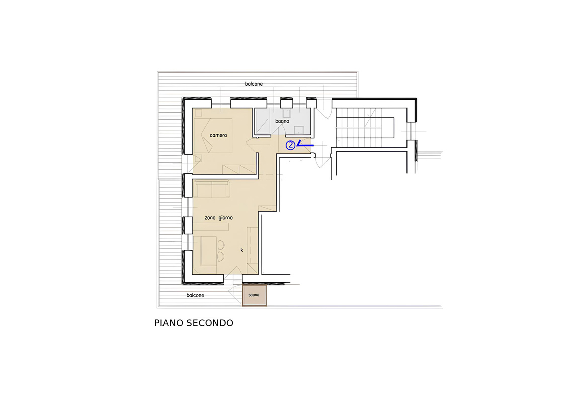 trilo 6 Sas Ciapel - 41 m² - 2 ložnice s manželskou postelí či 2 samostatnými lůžky, obývací pokoj s kuchyňským koutem a rozkládacím gaučem pro 2 osoby, sociální zařízení se sprchou, balkon s privátní bio saunou; apartmán se nachází v podkroví