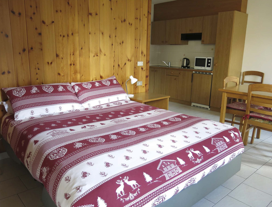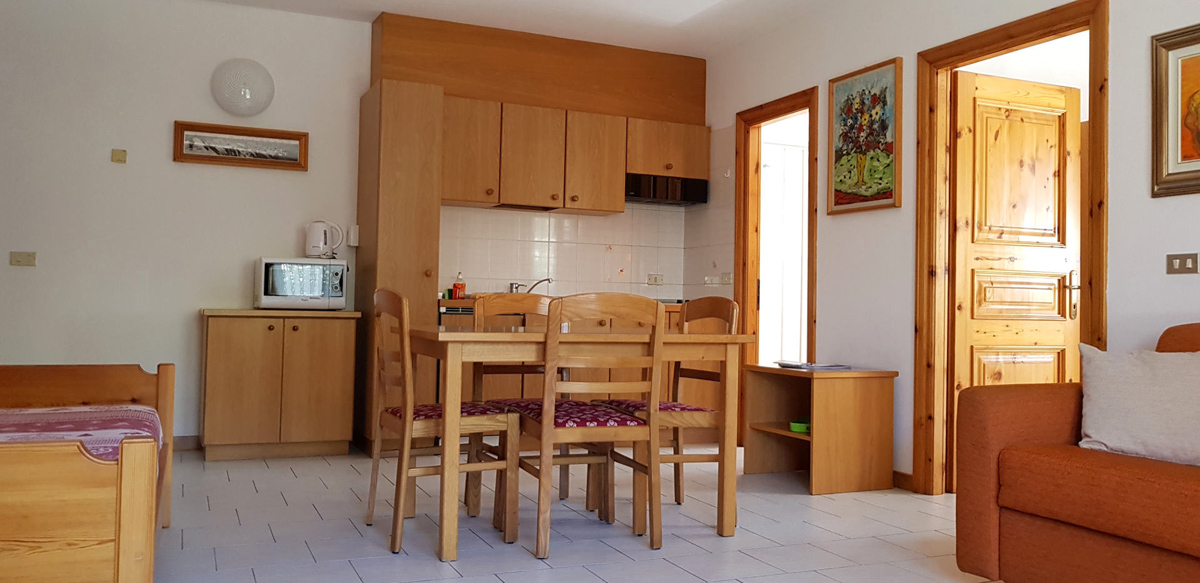 45 m² - 1 ložnice s manželským lůžkem, obývací pokoj s kuchyňským koutem a gaučem, sociální zařízení se sprchou, terasa; apartmán se nachází v přízemí