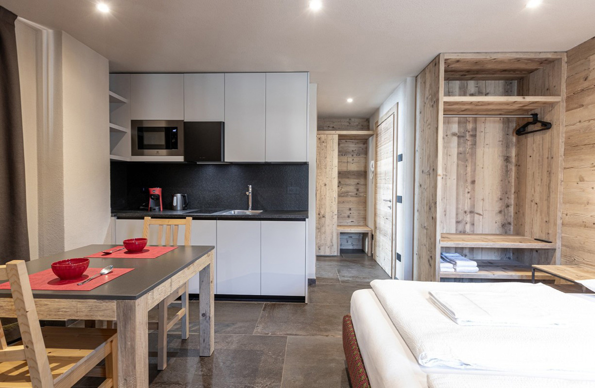 40 m² - 1 ložnice s manželskou postelí či 2 samostatnými lůžky, obývací pokoj s kuchyňským koutem a rozkládacím gaučem pro 1 osobu, sociální zařízení se sprchou, terasa; apartmán se nachází v přízemí